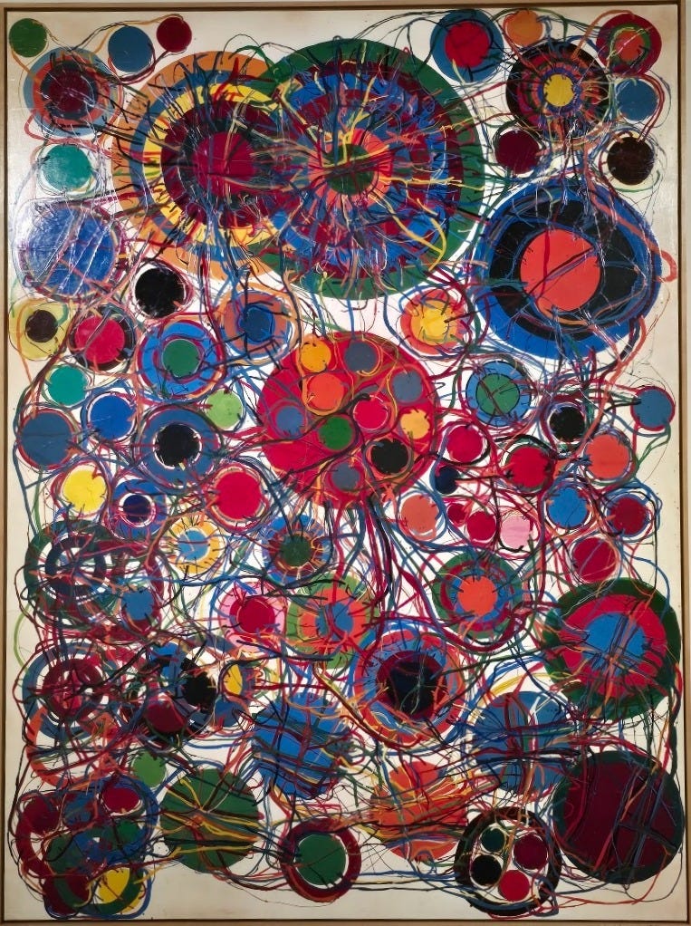And in her monumental (wall-size) work from 1965-69, Gate of Hell, she ramped up not only the scale but also the power and the intensity. Peering up at this canvas, I felt this to be an image of hell as entanglement and of continuous dazzlement...