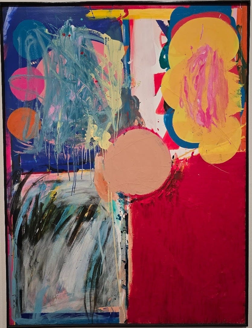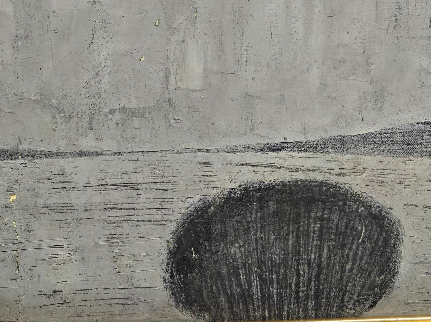 The smaller dark shape suggests a clump of trees, or then again, just a fuzzy form… are the two objects competing for the horizon, or is there a more subtle dance going on here? When I looked at the painting from the point of view of the black clump, I saw it as a viewpoint for the area beyond it, which suggests a landscape. But where I stepped back, the other larger object complicated that view. The effect was to keep the viewer almost literally off balance.