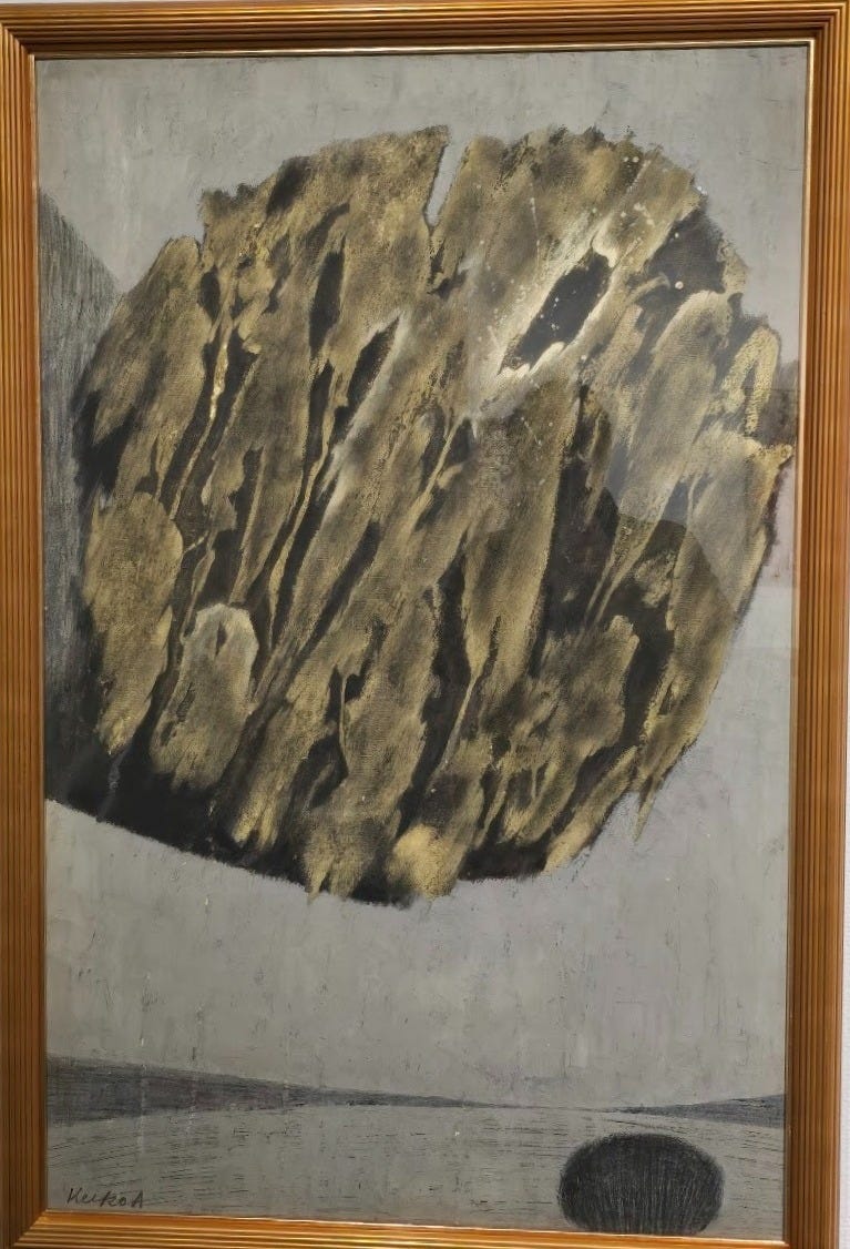 Finally, from this first look at the artists in this remarkable exhibition, here is work by Keiko Akana, whose Objects in the Space (1958) I found to be one of the most haunting works on display. There’s a palpable sense of foreboding or tension in the scene. Is something about to happen? Is the giant object a boulder in a huge hand? Or is the work to be understood simply as abstracted emotion?