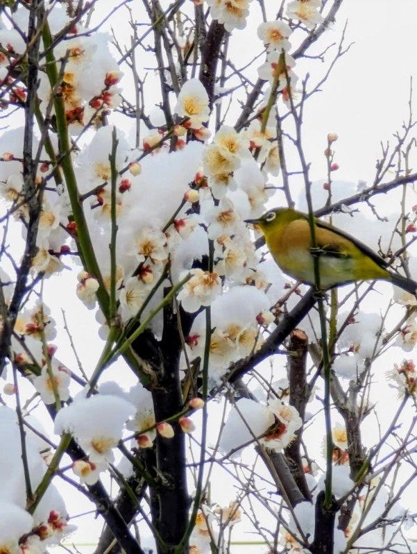 The poet says she doesn’t know what bird it was, and neither do I. But the poem reminds me that one of the joys of a snowy day in Tokyo is the sight of the plum trees, already in blossom, laden with fluffy white snow. And if I’m lucky, I’ll spot a mejiro, a Japanese white-eye, scattering snow as it seeks the now-hidden flowers and their promised goodness.