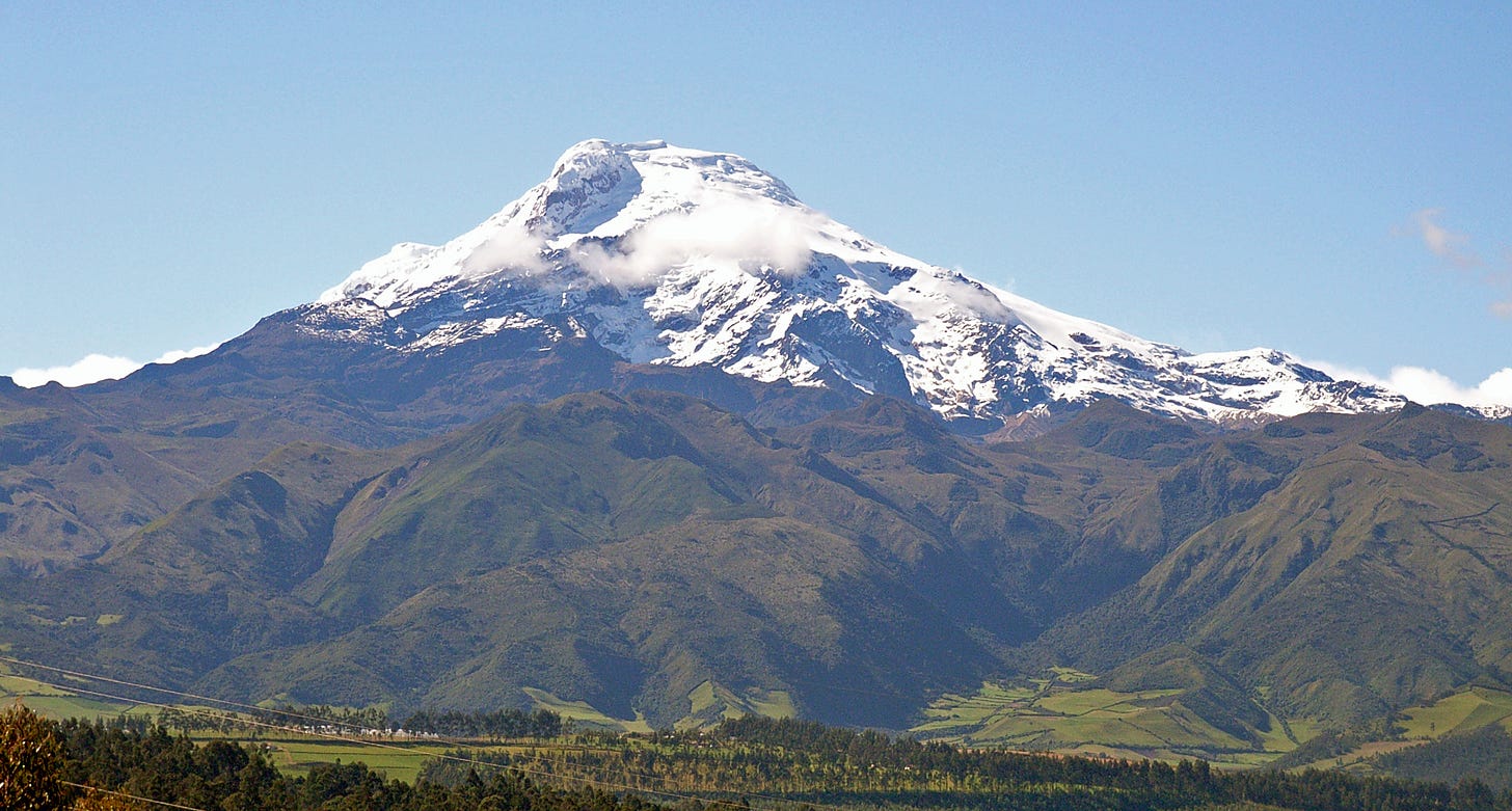 I used to live in Quito, which is on the equator. The city is at about 2,800 metres above sea level, and from my perch in the city, I could admire the volcanoes that proudly displayed their equatorial snow all year round – among them, Cayambe and Antisana, both well over 5,500 metres. I would never tire of the wonder they inspired.